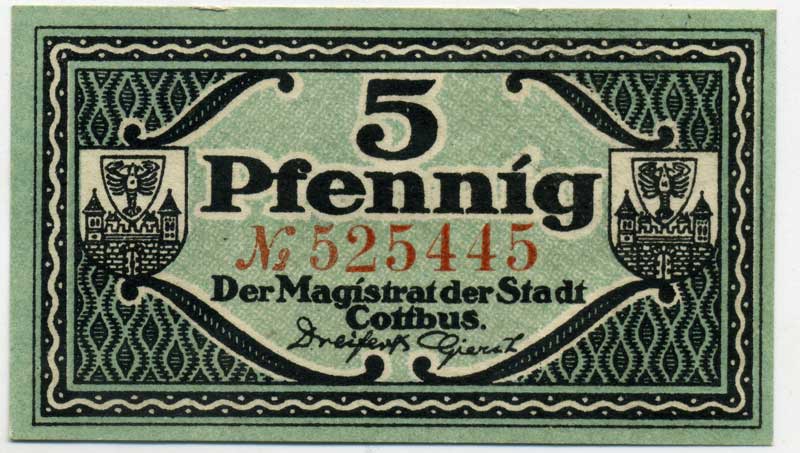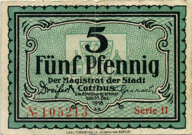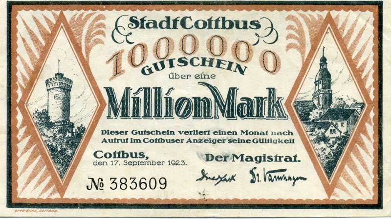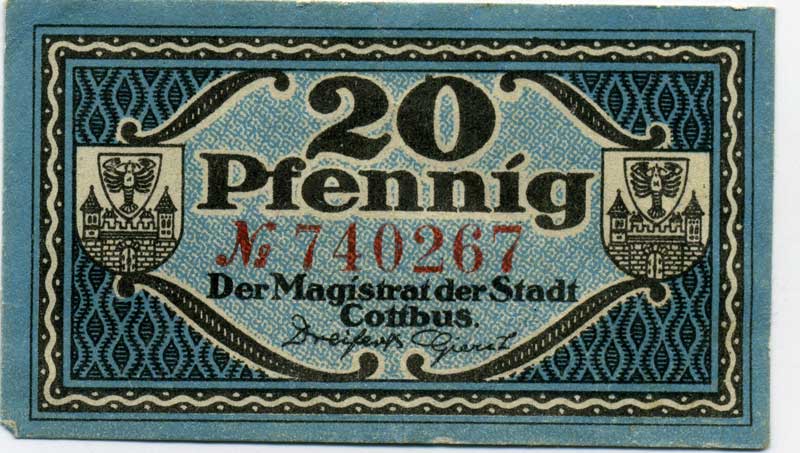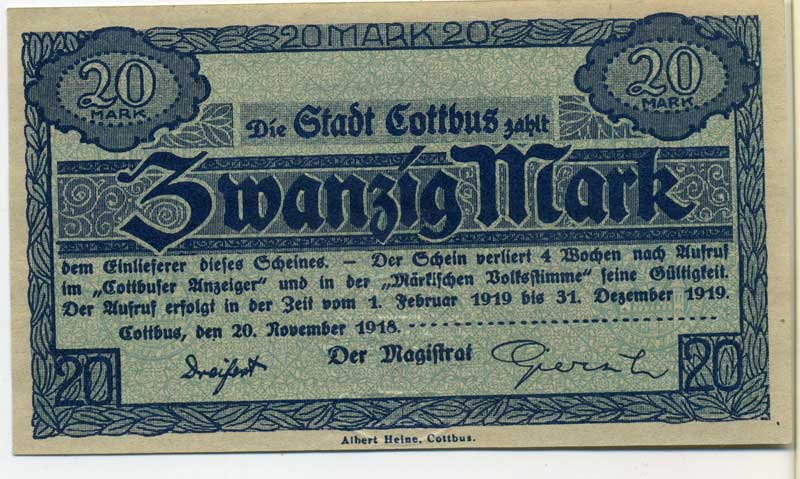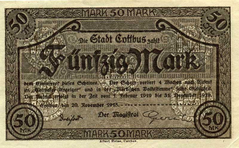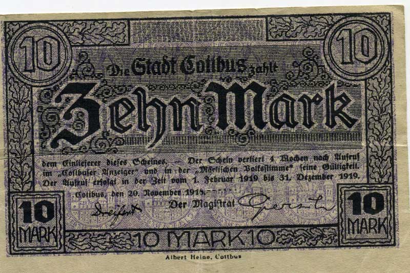 Ab 1918 wurden alle Cottbuser Banken wie die Niederlassung der Bank für Handel und Industrie, die Filiale der Commerz- und Disconto Bank oder die Niederlausitzer Bank darüber informiert, dass sie städtisches Notgeld ausgeben durften. Durch die Abschaffung der Golddeckung und die finanzielle Mobilmachung für den Krieg wurde bereits 1914 eine Geldentwertung in Gang gesetzt. Die Kriegsschulden beliefen sich 1918 auf etwa 150 Milliarden Reichsmark. Sie wuchsen im Jahr 1922 sogar auf die zwölfstellige Summe von 192 Billionen Mark an. So bedeutete die Inflation zu Beginn der Weimarer Republik für die Cottbuser Bevölkerung ein neues Elendsdasein.