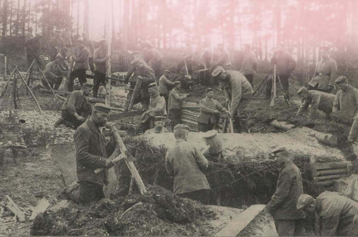 Zum Hinlegen war eine Pritsche von Stangen zusammengebaut, war aber nur so groß, dass sich vier oder fünf Mann hinlegen konnten. Es war immer eine Wache eingeteilt. Zwei Stunden Wache, vier Stunden Ruhe im Bunker, aber am Tage, oft auch bei Nacht musste außerdem gearbeitet werden. [...] Es mussten bombensichere Bunker gebaut, Reservegräben ausgehoben und Bauholz geholt werden...